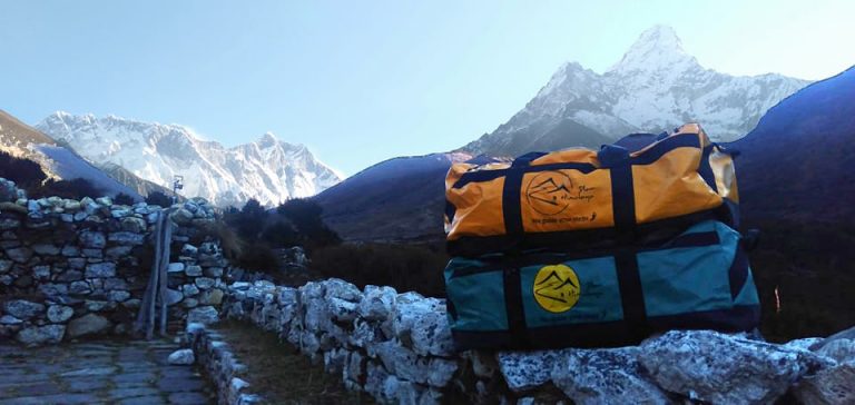 - Y por último una mochila más grande o bolsa blanda (no maleta rígida) donde pondréis aquello que no necesitáis durante el día y que encontraréis en el lodge cuando lleguéis: el saco de dormir, ropa de muda, neceser, etc. Pensad que no vais a poder acceder al contenido de esta bolsa hasta vuestra llegada al lodge. Los porteadores van a su ritmo y puede que ni siquiera hagan la misma ruta que vosotros. Las bolsas además van atadas formando un paquete compacto.