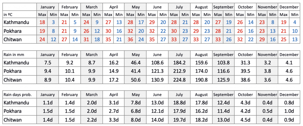 CLIMA. Nepal es un país subtropical y suele hacer calor durante buena parte de las épocas más frecuentadas. Por las mañanas y noches de primavera y otoño puede hacer un poco de fresquito. En invierno Kathmandu o Pokhara pueden ser como el sur de Europa. De junio a septiembre tenemos los monzones con lluvias. Naturalmente en los treks tiene otra dimensión.
