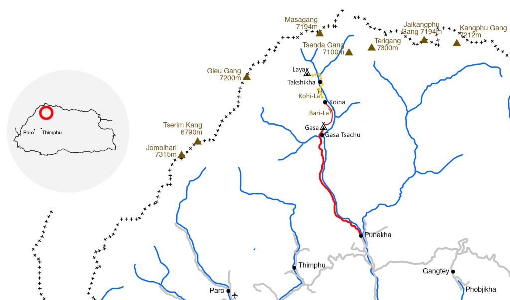 Este pequeño trek se realiza en acampada y el material es transportado en mulas o yaks. Hemos preferido hacer la primera noche en Gasa, que también será una visita interesante, evitando acampar en Koina donde suele haber barro, y poder ir directamente a Laya. De regreso acamparemos en Gasa Tshachu, donde podremos disfrutar de un baño en sus aguas termales como broche para este corto, pero interesantísimo, trek.