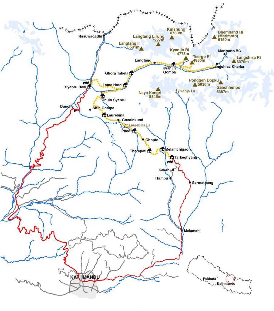 El inicio de este trek está bastante cerca de Kathmandu y va progresando dirección norte, comenzando por la zona de Helambu entre campos, bosques, montañas bajas y poblaciones sherpas y Tamang, para cruzar el paso de Laurebina-la y entrar en Gosainkund, con su conjunto de pequeños lagos sagrados, y los valles del Langtang, ya muy cerca del Tíbet.
